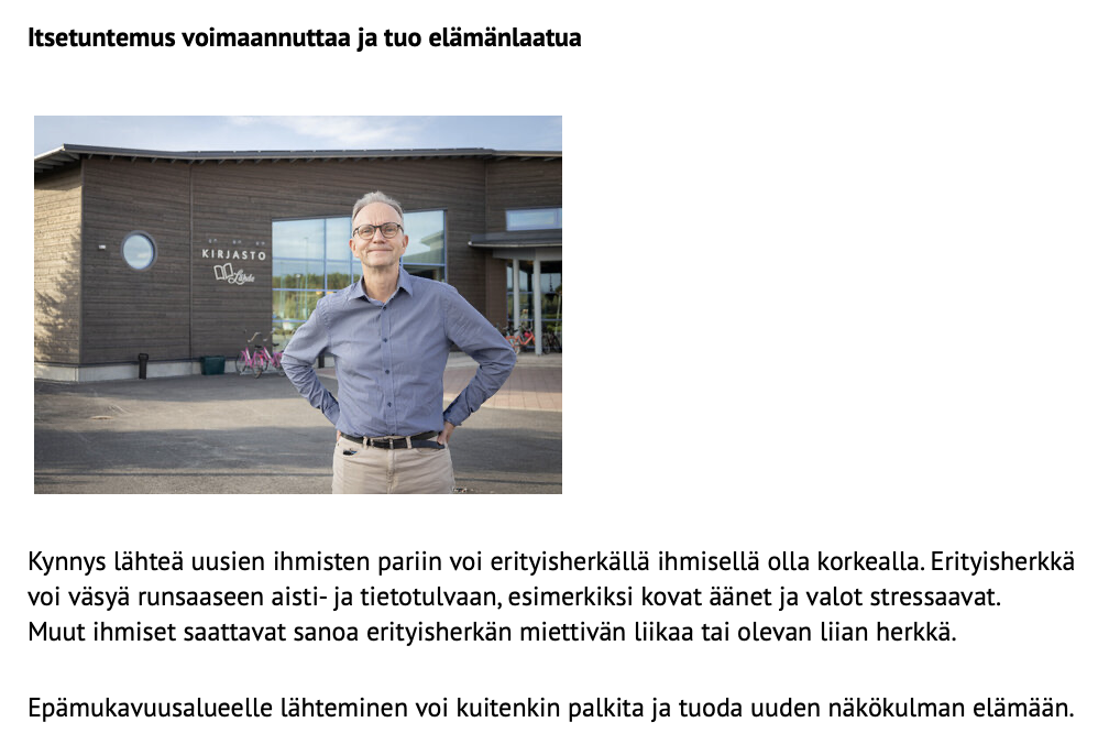 - Kun erityisherkkä tiedostaa, mikä sopii itselle ja mikä on liikaa, voi säädellä omaa jaksamistaan ja olla armollinen itselleen. Itsetuntemuksen myötä voi tehdä itselle sopivia valintoja.